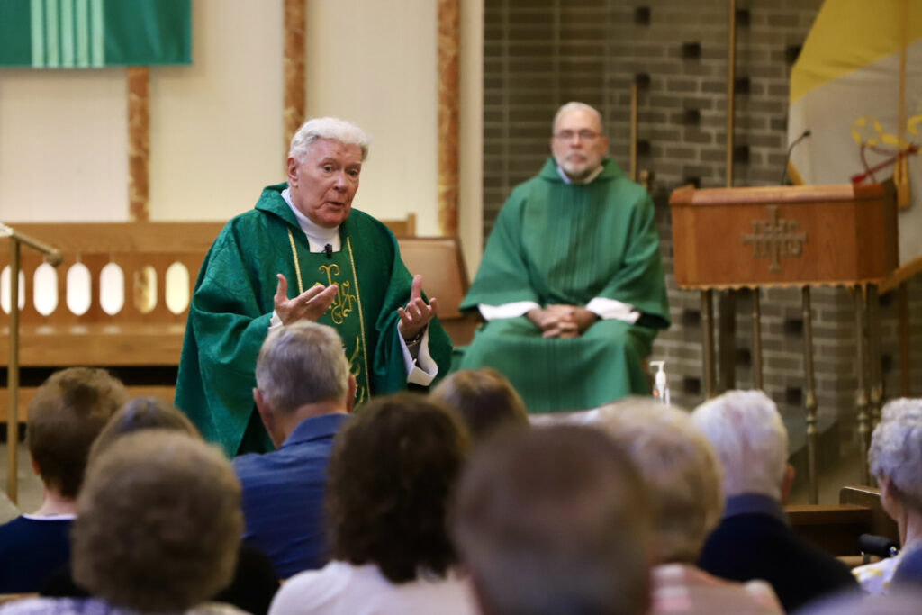 During a Mass Sept. 11 celebrating those 90-plus and 100-plus years of age, Msgr. James Tracy, above, likened seniors to shepherds who cared for their children and families among the trials and tribulations of their lives, when no doubt they questioned their efforts. “But you never gave up, and you always prayed,” he preached. The annual Mass for Centenarians and Nonagenarians, sponsored by VITALity Catholic Healthcare Services, was celebrated in Saint Isidore Church, Christ the Good Shepherd Parish, Vineland. Father Junior Flores, parish administrator, was concelebrant. Deacon Jerry Jablonowski, VITALity’s executive director, thanked the seniors for their lifetime of dedication to the faith.