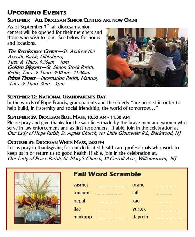 - Upcoming events for September and October;