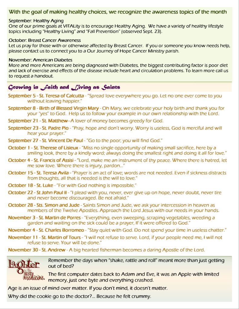 As a member of the VITALity “LIFE TO THE FULLEST” Senior Health and Well Being Membership Program, you will receive health and well-being resources that address your mind, body and spirit for healthy aging. Select any of the resources below that you would like sent to you. In addition, a quarterly LIFE TO THE FULLEST newsletter will be emailed to you with current health and well-being information, tips and upcoming VITALity events for seniors.