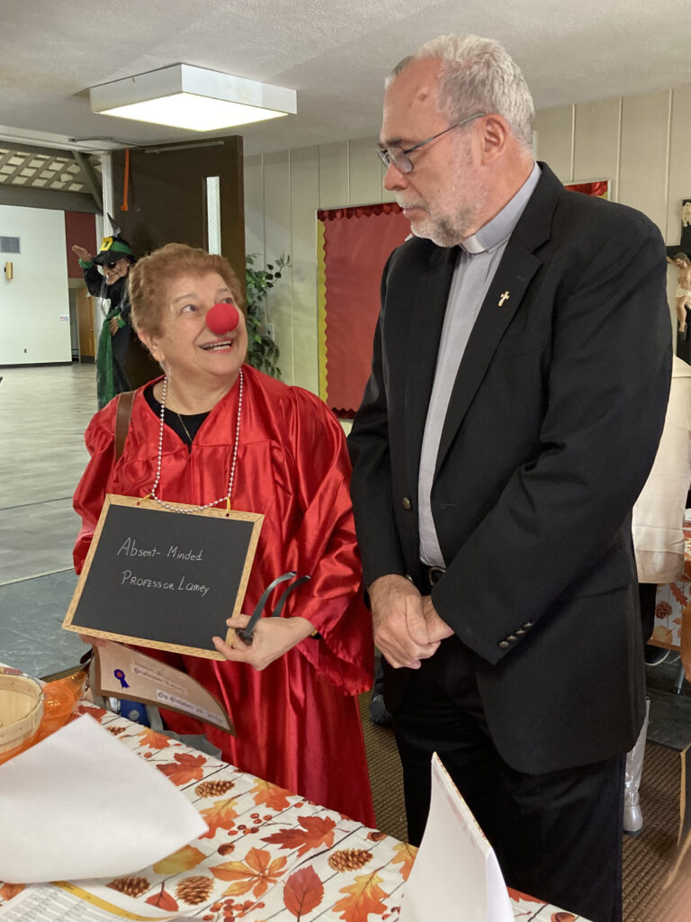 Deacon Jablonowski reacts to Mary Lamey’s costume during a Halloween party for seniors last fall at Church of the Incarnation, Mantua.